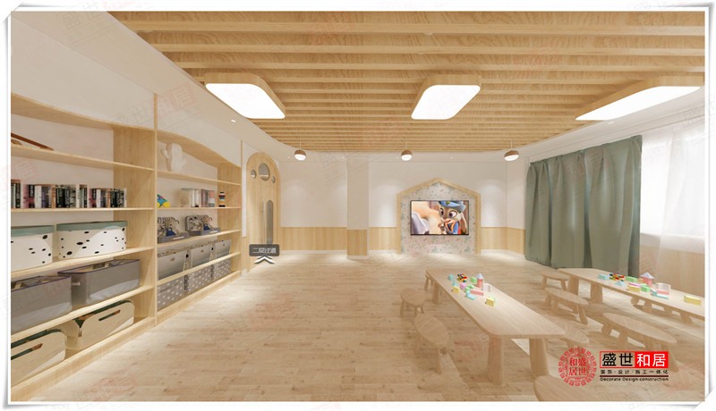 本案為安徽盛世和居裝飾承接的伊貝幼兒園裝修項目的設計效果圖。合肥幼兒園裝修公司的設計師在用色上,基本使用了白色及原木色兩種色調(diào)。白色是萬能搭配色,而原木色調(diào)的材質(zhì)能給幼兒園一種接近大自然的感覺。因為原木色取之于木材,其紋理的美感以及木材本身散發(fā)出木質(zhì)的特有香氣都能讓人感覺溫馨舒適。